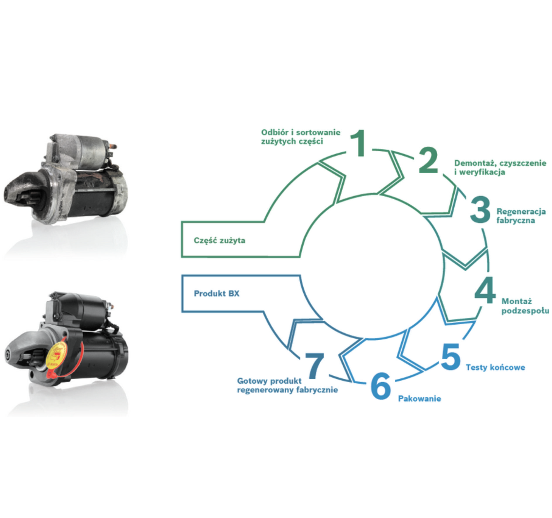 Warto wiedzieć, że fabryczna regeneracja części to nie to samo, co naprawa części w warsztacie! Kupując produkt oznaczony symbolem BX, czyli Bosch eXchange, masz pewność, że został on przygotowany w certyfikowanych zakładach Bosch z uwzględnieniem tych samych specyfikacji i technologii, jak przy produkcji fabrycznie nowych odpowiedników. Części podlegające regeneracji fabrycznej nie są obciążone mechanicznie (na przykład obudowy rozruszników i alternatorów) lub ich budowa jest zaprojektowana z odpowiednim zapasem wytrzymałościowym (korpus wtryskiwacza, zacisk hamulcowy). Dzięki temu ponowne użycie rdzeni jest w pełni bezpieczne i zapewnia poprawne funkcjonowanie przez długi czas.