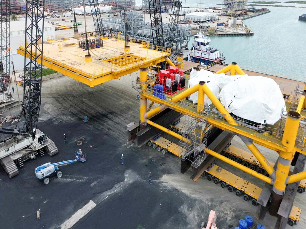 Działając na otwartym terenie, pojazdy SPMT najpierw przetransportowały górną część konstrukcji platformy roboczej między czterema dźwigami. Po podniesieniu konstrukcja podstawy została umieszczona pod nią z milimetrową precyzją, co umożliwiło dokładne ustawienie górnej części, a następnie jej przyspawanie na miejscu.